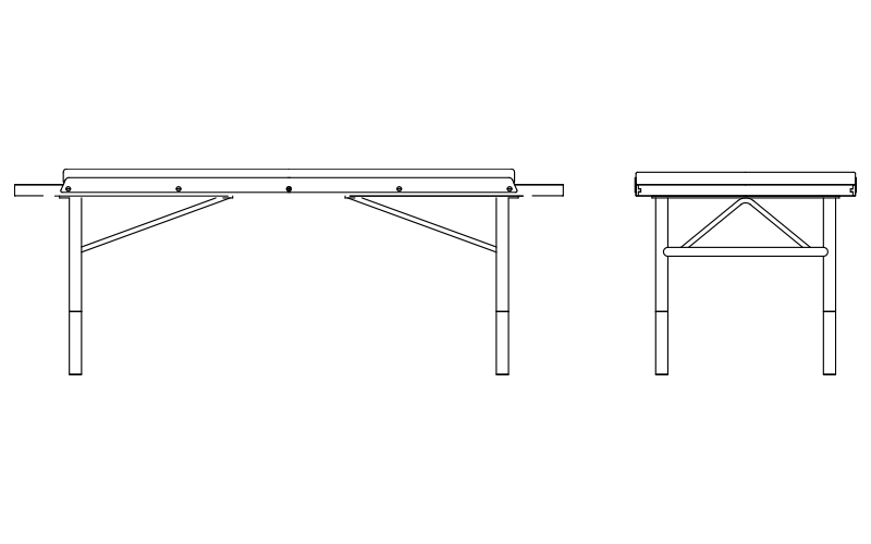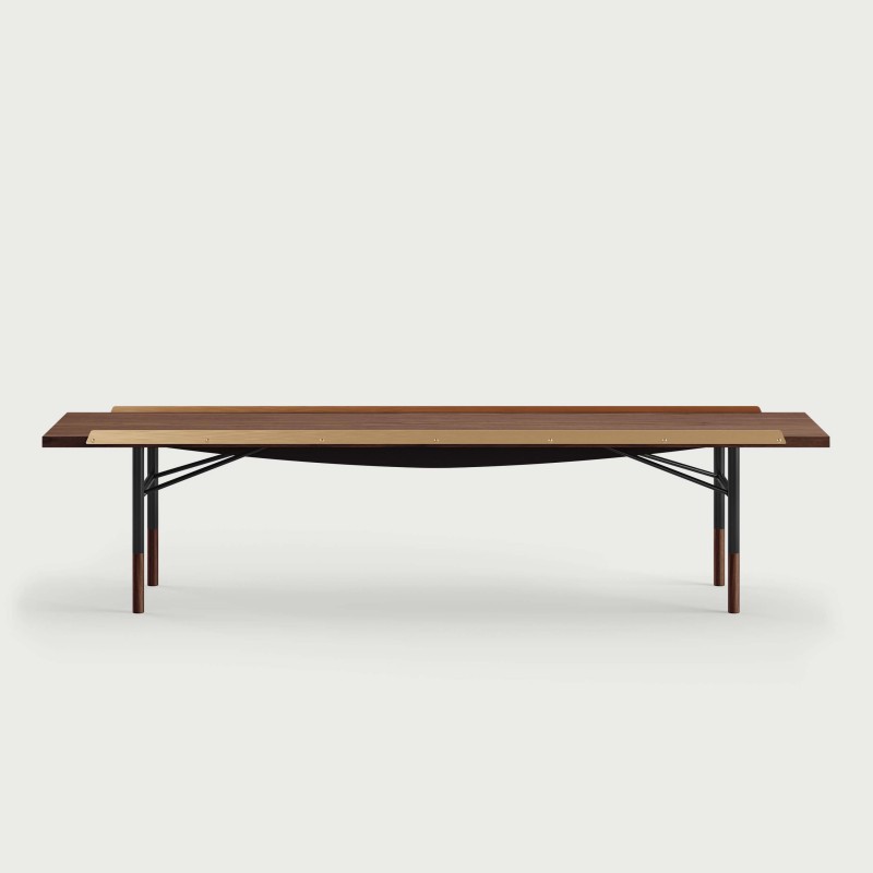 Materials: Teak, oak, walnut, Oregon pine veneer or black linoleum and matching wooden toes.  Legs in burnished or painted steel in black, orange or light blue.  With or without brass edges.  With or without cushion in textile or leather.